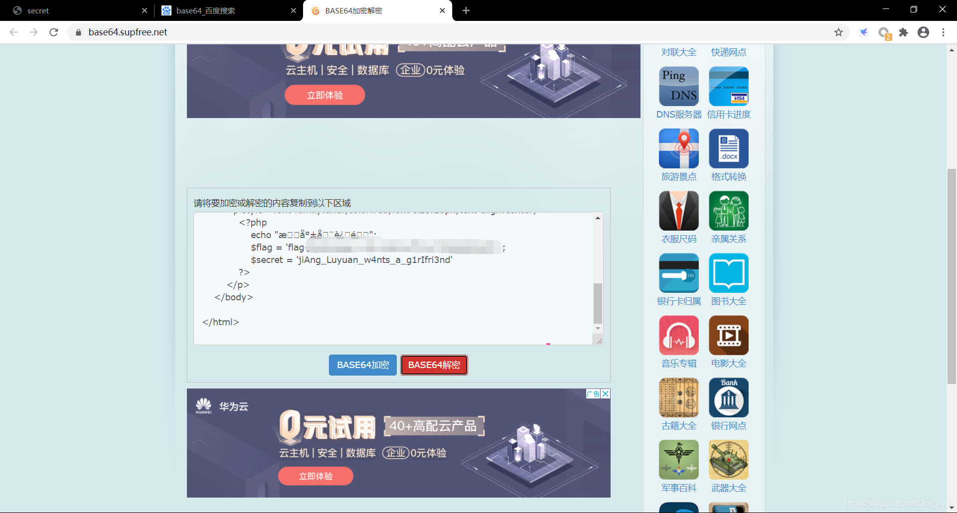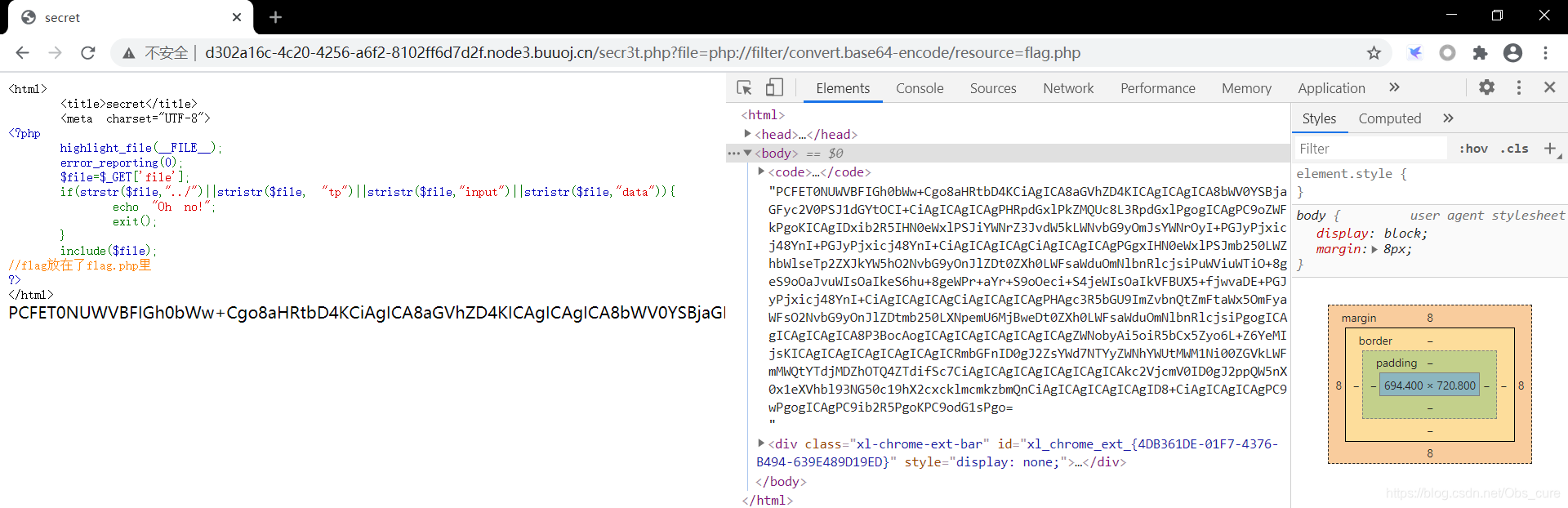 至此之后彻底没思路了。看师傅的writeup,经提醒,这是一个文件包含漏洞,涉及php伪协议。在查阅了协议,伪协议,php文件访问等相关资料后,个人理解协议就是一个封装好的访问文件的函数。这道题没有过滤php://filter协议。而php://filter协议可以读取php文件代码以base64编码输出。因此师傅构造了一个padload读取flag.php的源码。